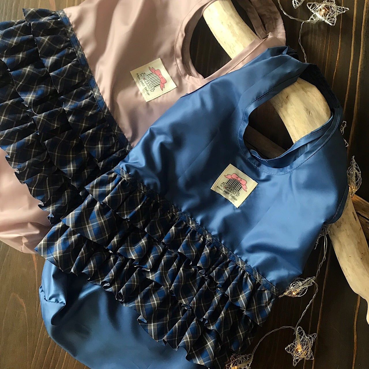 神戸タータンの3段フリルがフェミニンですが、本体のくすみカラーで落ち着いた大人かわいいバッグです。
